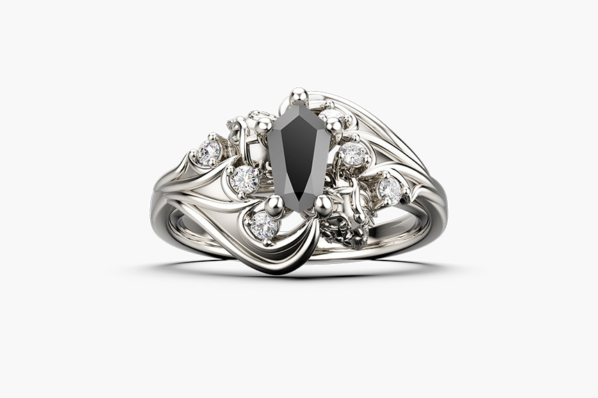 The engagement ring boasts a bold black coffin-cut diamond framed by bat wings and shimmering white diamonds.