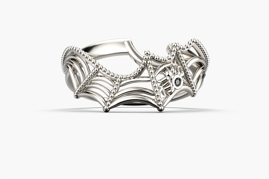 The spider web wedding ring fits seamlessly next to it, accented with a single black diamond for added allure.