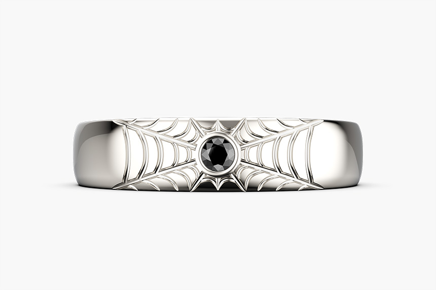 For him, the platinum gents wedding ring features a sleek spider web motif and a central black diamond—a strong, sophisticated statement of commitment.